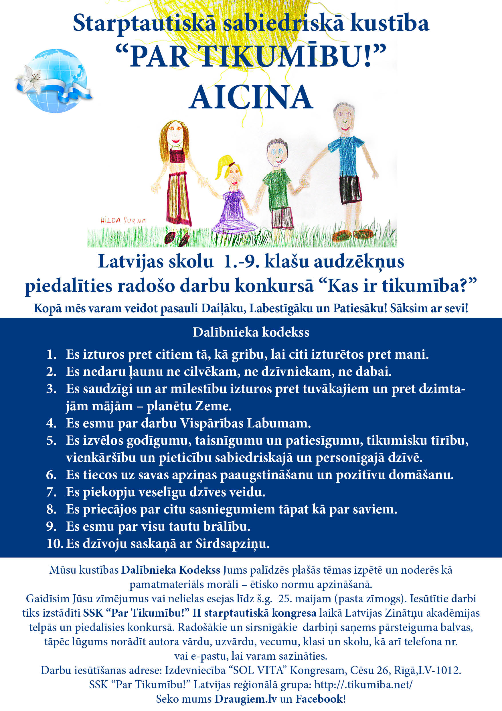Starptautiskā sabiedriskā kustība “Par Tikumību!” aicina Latvijas skolu un dārziņu audzēkņus piedalīties radošo darbu konkursā “Kas ir tikumība?”. Gaidīsim zīmējumus, nelielas esejas vai stāstiņus – tēmas izpētē noderīgs palīgs būs kustības Dalībnieka Kodekss. Visi darbiņi tiks izstādīti SSK “Par Tikumību!” II kongresa laikā koncertzāles “Rīga” telpās (Zinātņu akadēmija) un piedalīsies konkursā ar balvām, tāpēc lūgums norādīt savu vārdu, uzvārdu, vecumu, skolu un tālruni vai e-pastu. Iesūtīšanas adrese: Izdevniecība SolVita kongresam, Cēsu 26, Rīga, LV 1012. Termiņš – 25.maijs.